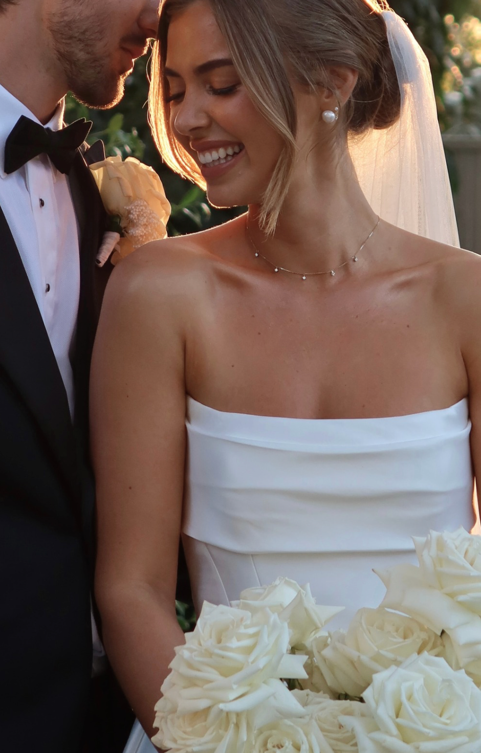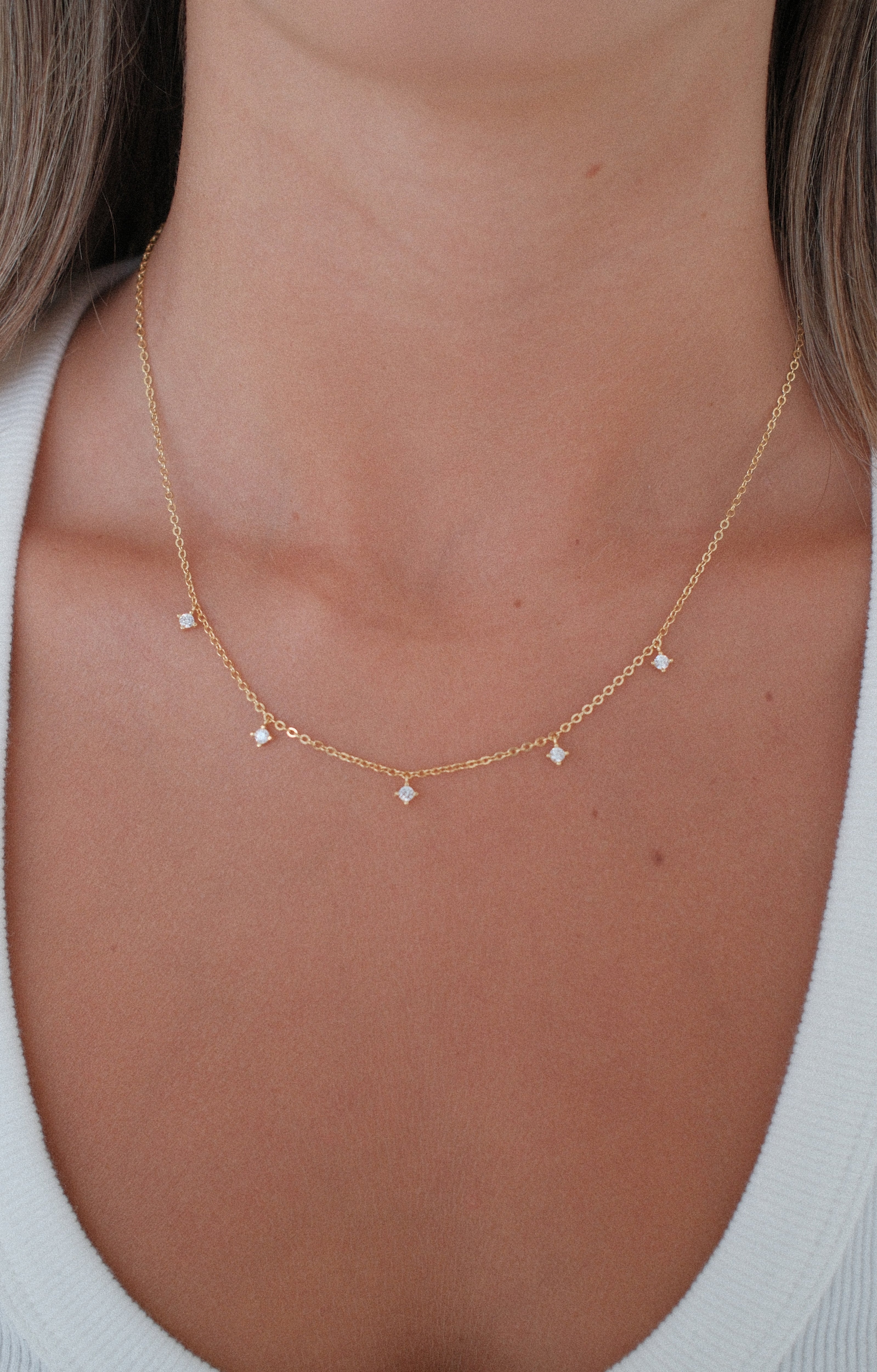 The Jayne Necklace features five sparkling Cubic Zirconia stones delicately set along a fine chain. Elegant and versatile, it adds a refined touch to any outfit — perfect for everyday wear, special occasions, or as a radiant accessory for a bride on her big day. Wear it alone for subtle sophistication or layer with other necklaces for a modern, curated look. A timeless piece that makes a thoughtful gift or a beautiful treat for yourself.