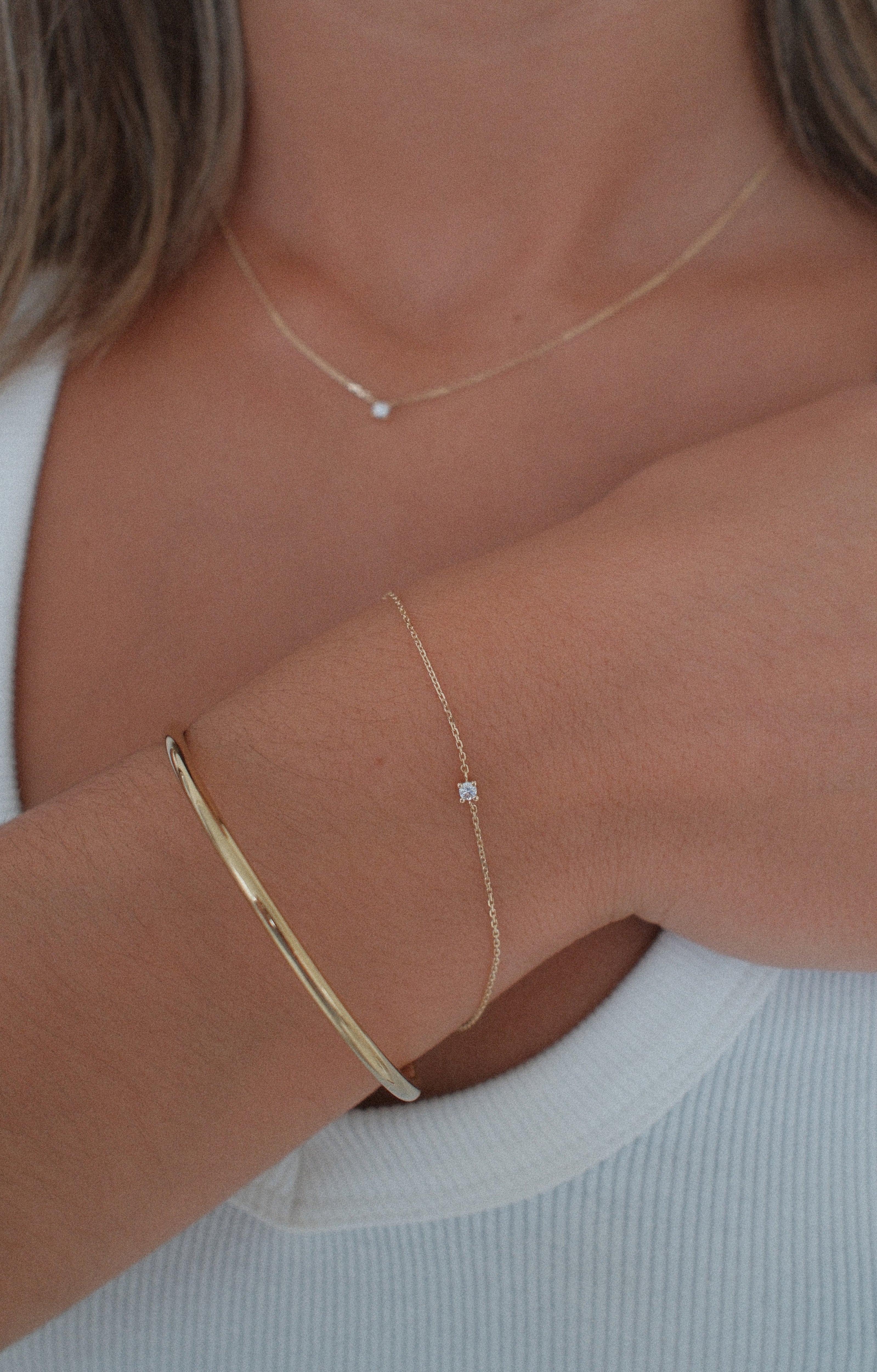 Add a touch of timeless elegance to your special day with our Newport Mini Diamond Bracelet, thoughtfully crafted as part of our exclusive Bridal Collection. This piece features a single petite square Moissanite diamond in a minimalist 9k gold band — perfect for brides seeking understated sophistication. Whether worn alone or layered with other pieces for a personalised look, this bracelet is designed to complement your wedding ensemble and remain a cherished keepsake long after “I do.”