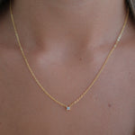 The Sophie Necklace showcases a petite, square-shaped Cubic Zirconia diamond on a fine chain. With its clean, minimalist design, it adds a subtle sparkle that's perfect for your wedding day and effortlessly wearable long after. Delicate, timeless, and made to be treasured.
