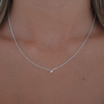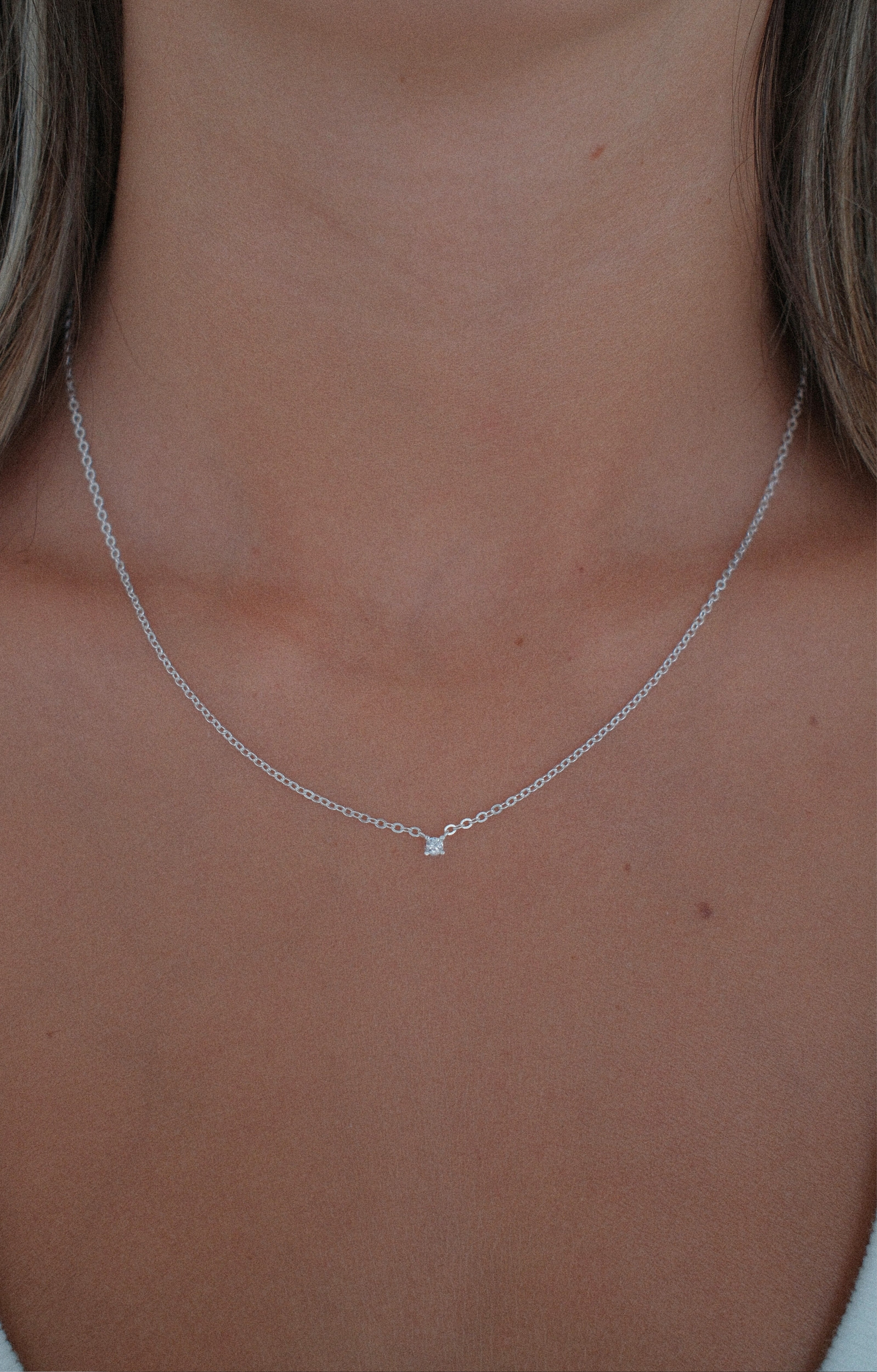 The Sophie Necklace showcases a petite, square-shaped Cubic Zirconia diamond on a fine chain. With its clean, minimalist design, it adds a subtle sparkle that's perfect for your wedding day and effortlessly wearable long after. Delicate, timeless, and made to be treasured.